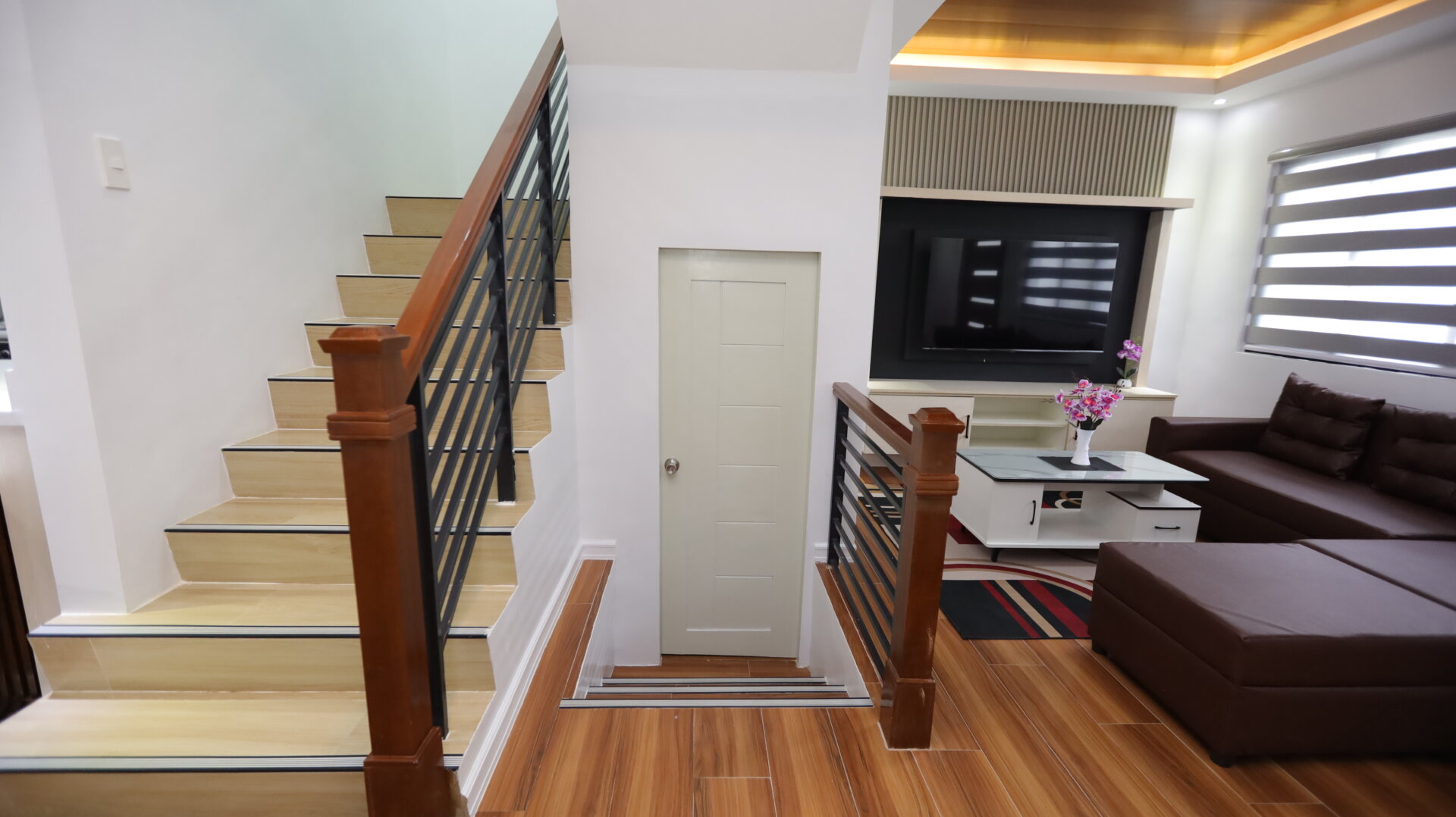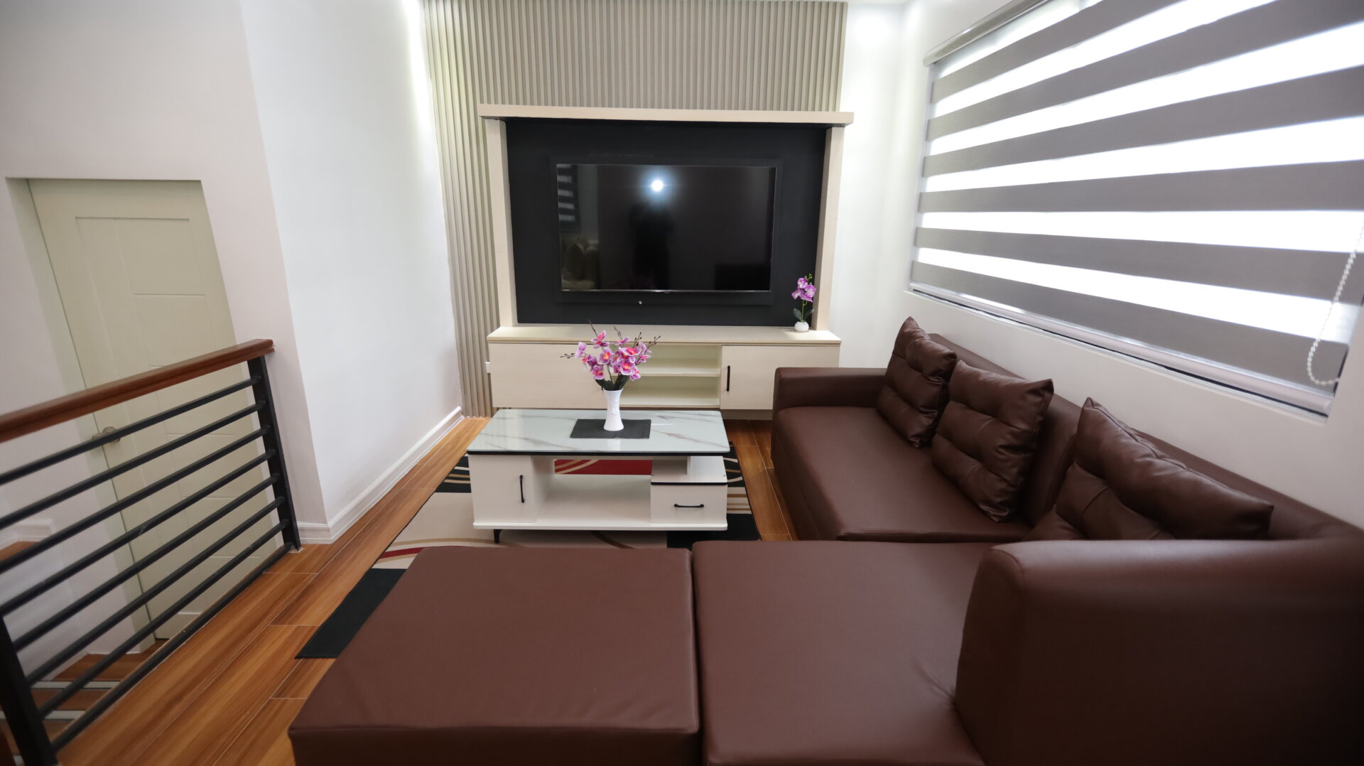 Relax in the cozy living room with plush seating and a smart TV for entertainment. A second lounge area upstairs offers extra privacy and space to unwind.