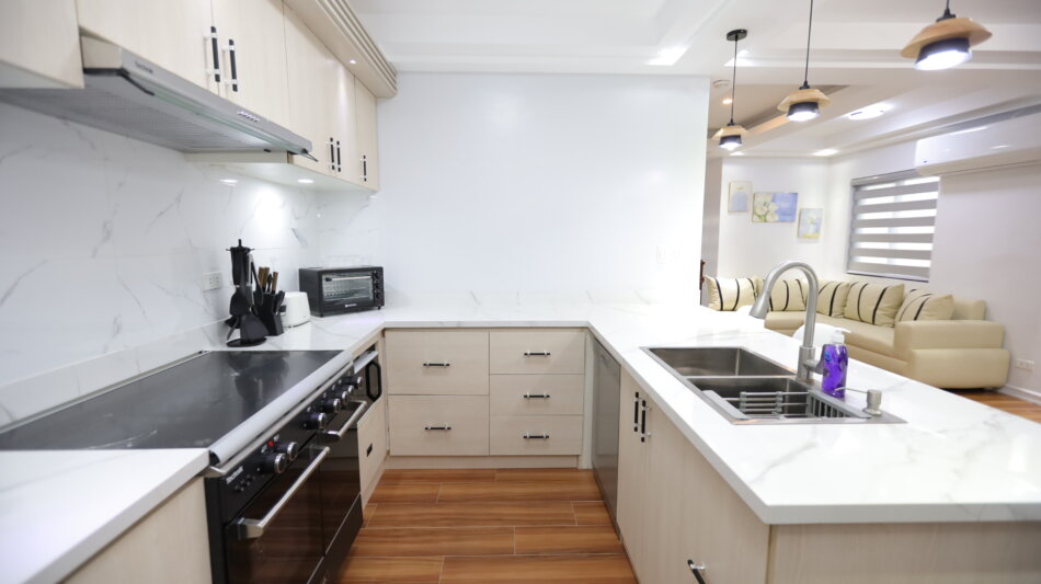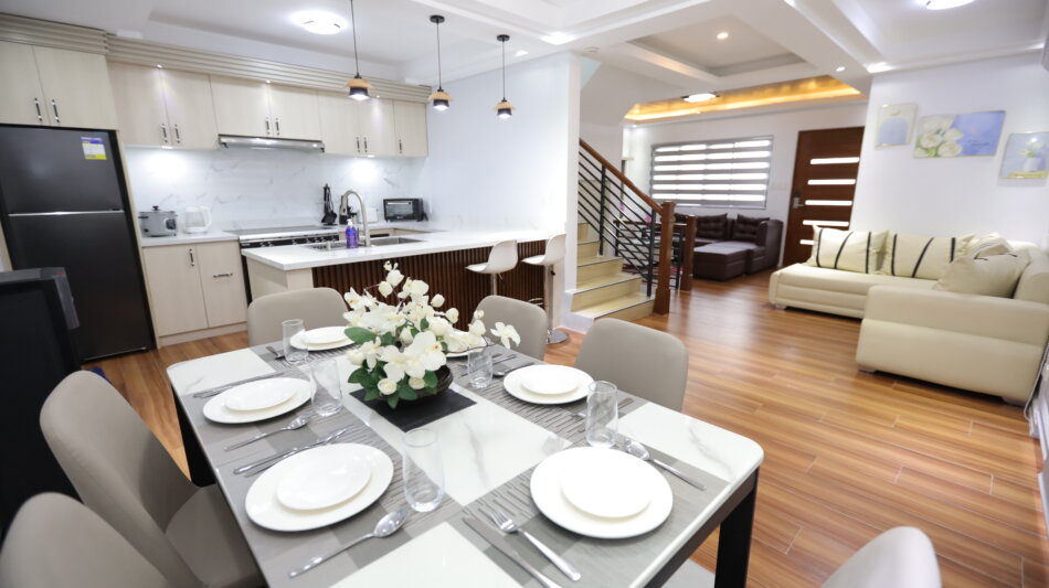 - Amenities: 2 Queen-size bed, 24/7 CCTV, 3 Bathrooms, 3 Bedrooms, Air-conditioned, Automatic Plate Dishwasher, Complimentary toiletries, Free Parking, Free wi-fi, Fresh linens and towels, Fully equipped kitchen (pots, pans, utensils), Hot and cold shower, Laundry, Refrigerator and freezer, Smart TV, Swimming Pool