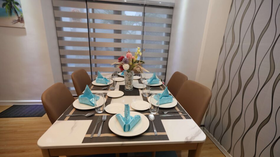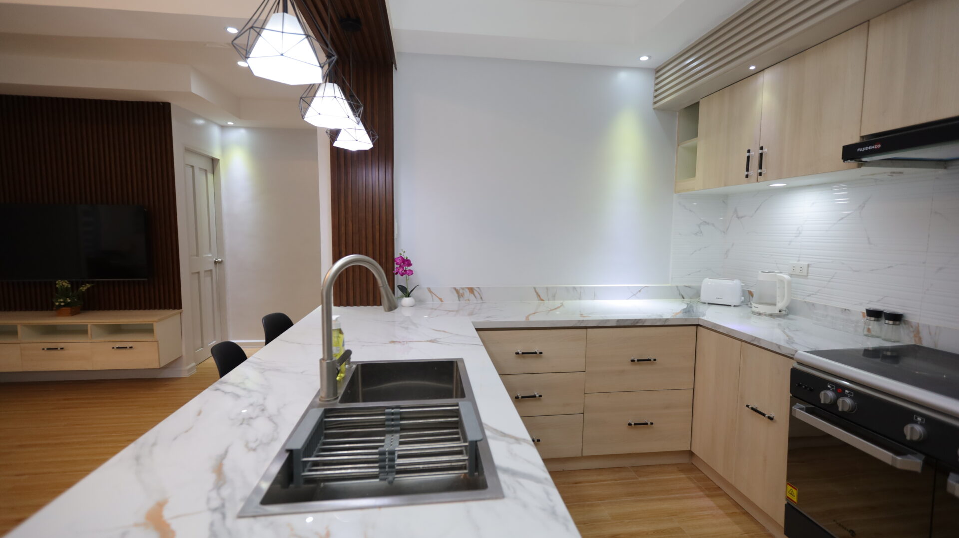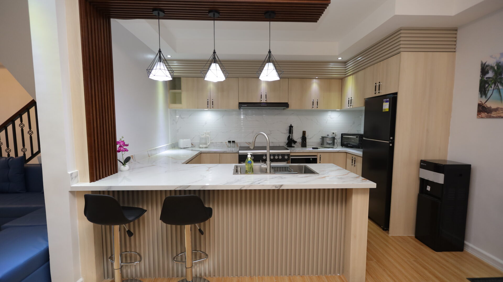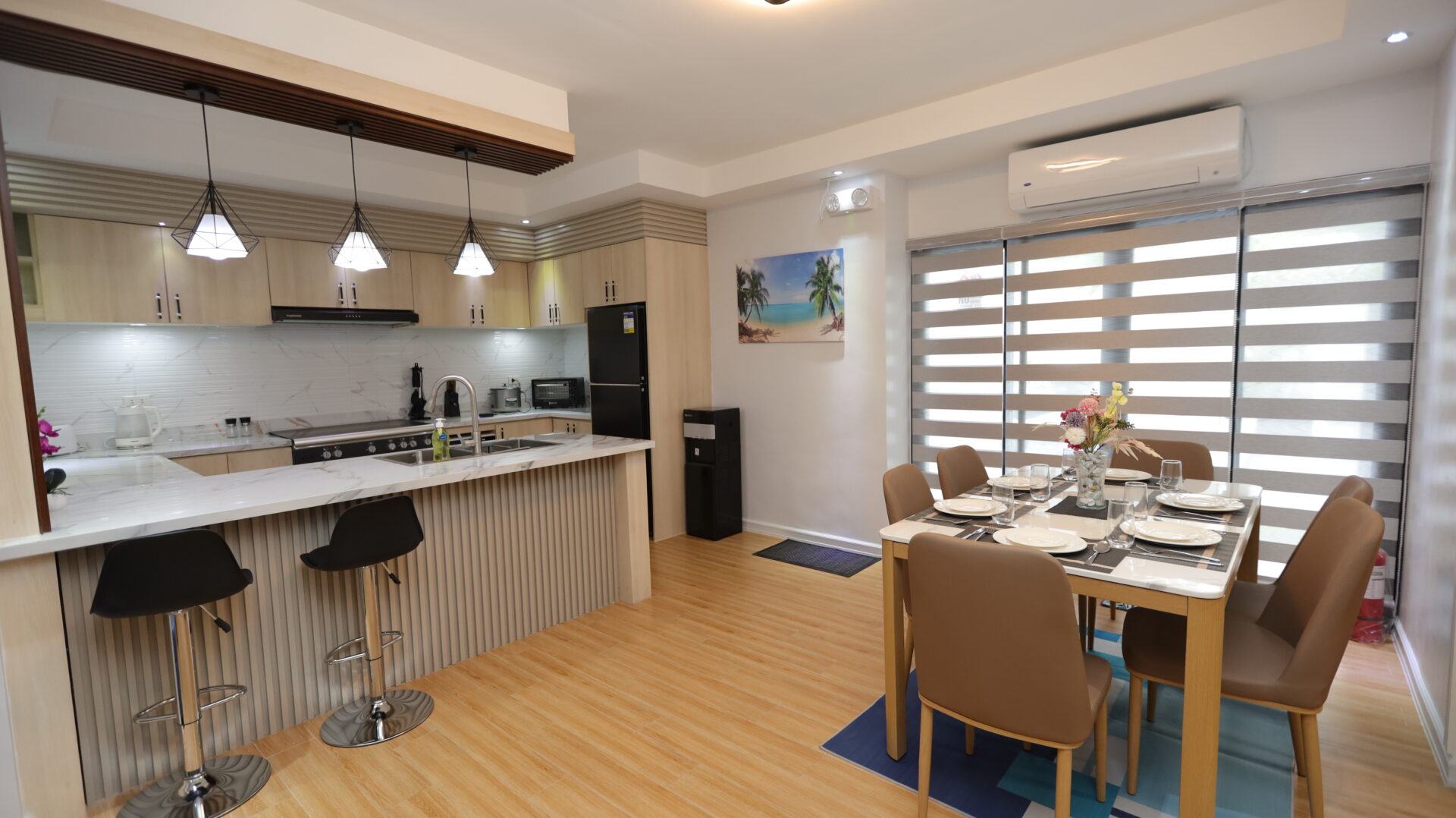 - Amenities: 2 Queen-size bed, 24/7 CCTV, 3 Bathrooms, 3 Bedrooms, Air-conditioned, Automatic Plate Dishwasher, Complimentary toiletries, Free Parking, Free wi-fi, Fresh linens and towels, Fully equipped kitchen (pots, pans, utensils), Hot and cold shower, Laundry, Refrigerator and freezer, Smart TV, Swimming Pool