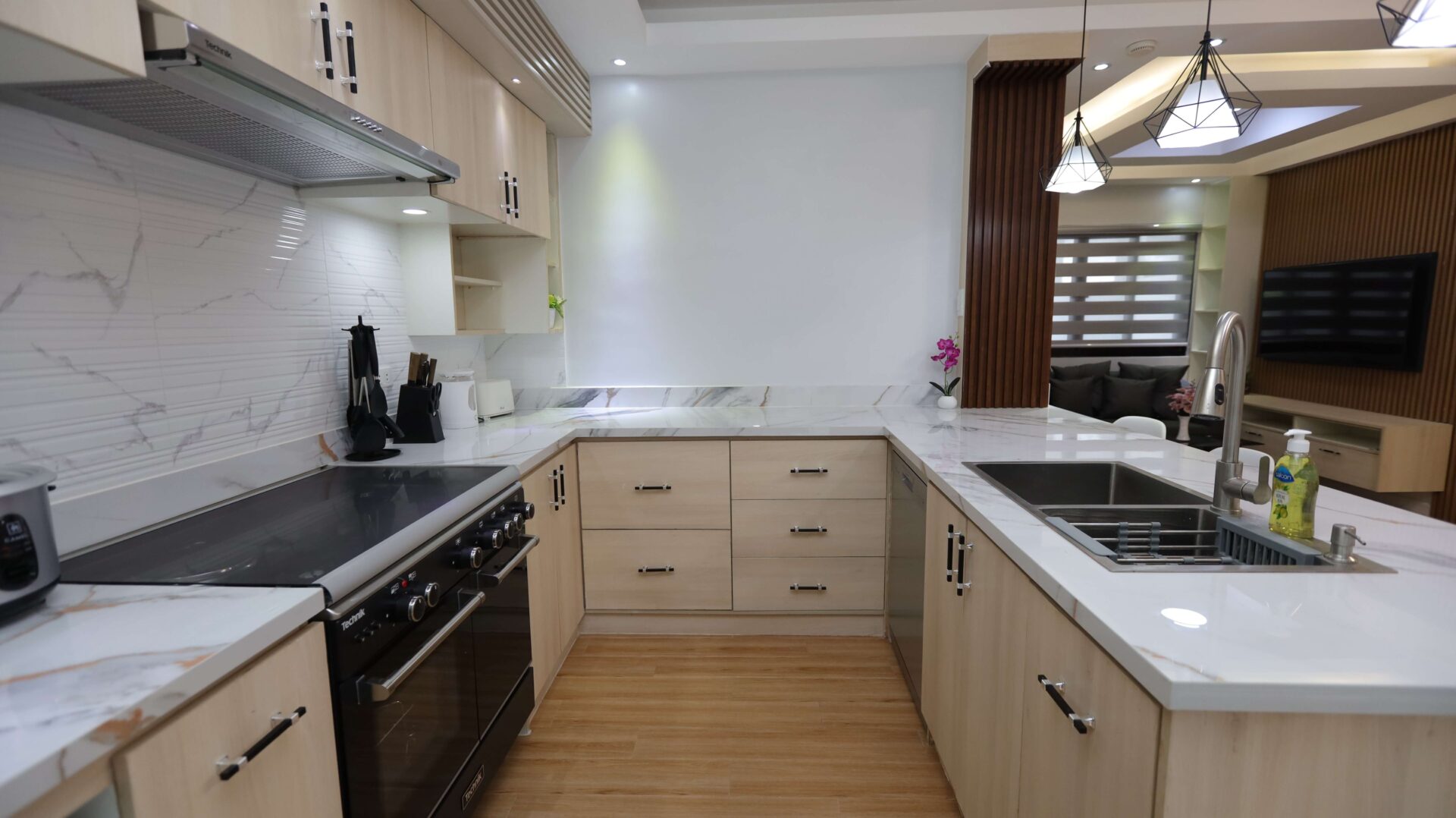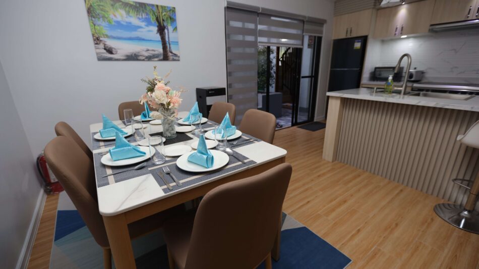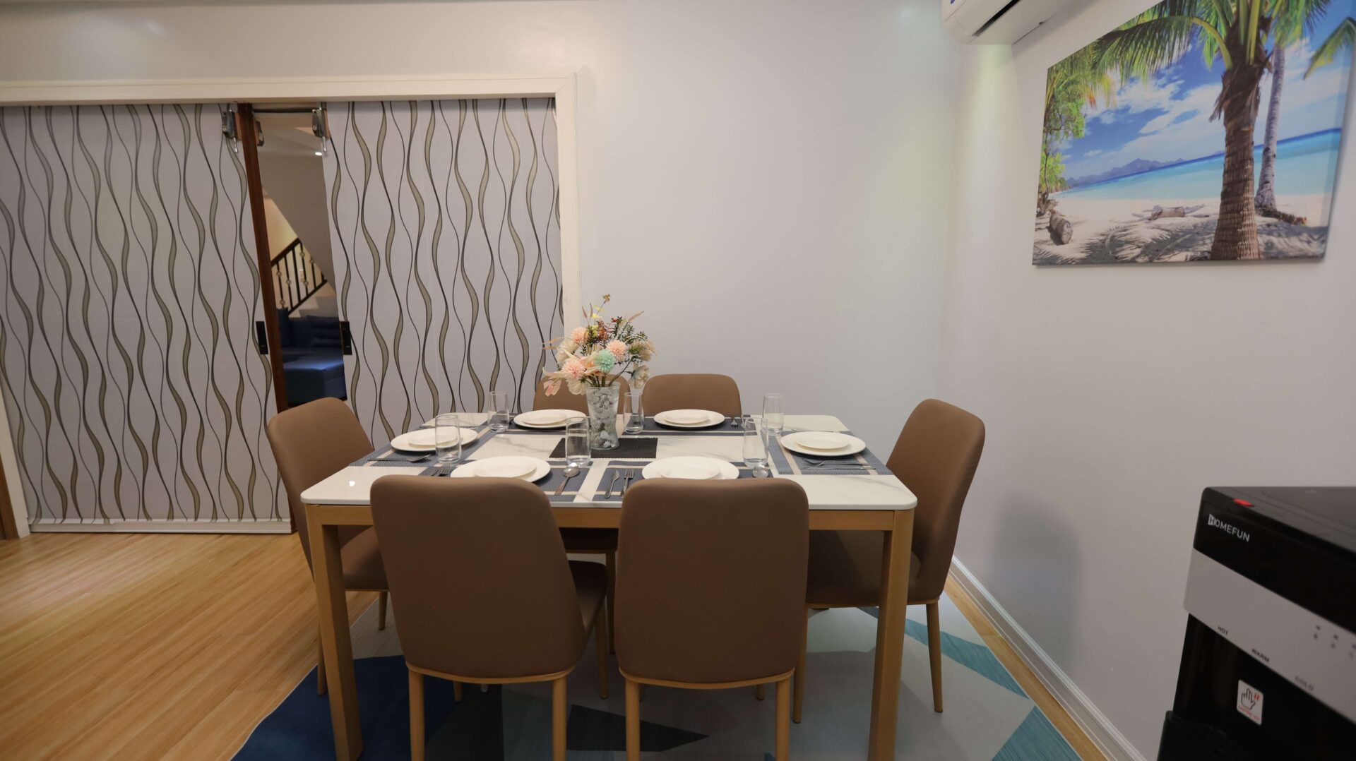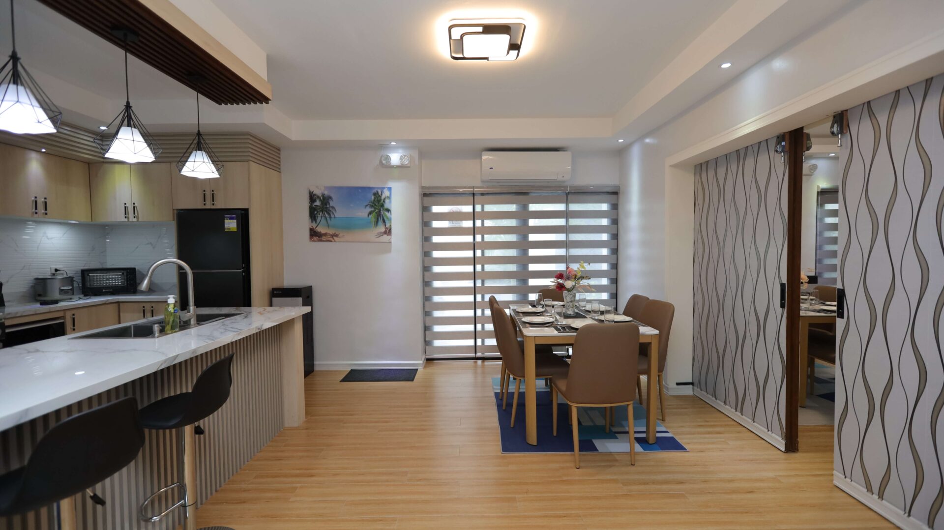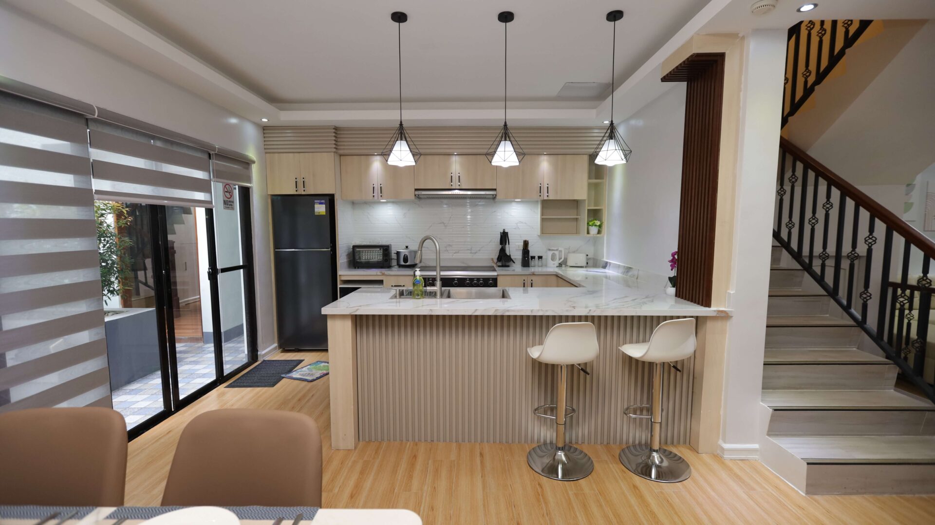 - Amenities: 2 Queen-size bed, 24/7 CCTV, 3 Bathrooms, 3 Bedrooms, Air-conditioned, Automatic Plate Dishwasher, Complimentary toiletries, Free Parking, Free wi-fi, Fresh linens and towels, Fully equipped kitchen (pots, pans, utensils), Hot and cold shower, Laundry, Refrigerator and freezer, Smart TV, Swimming Pool