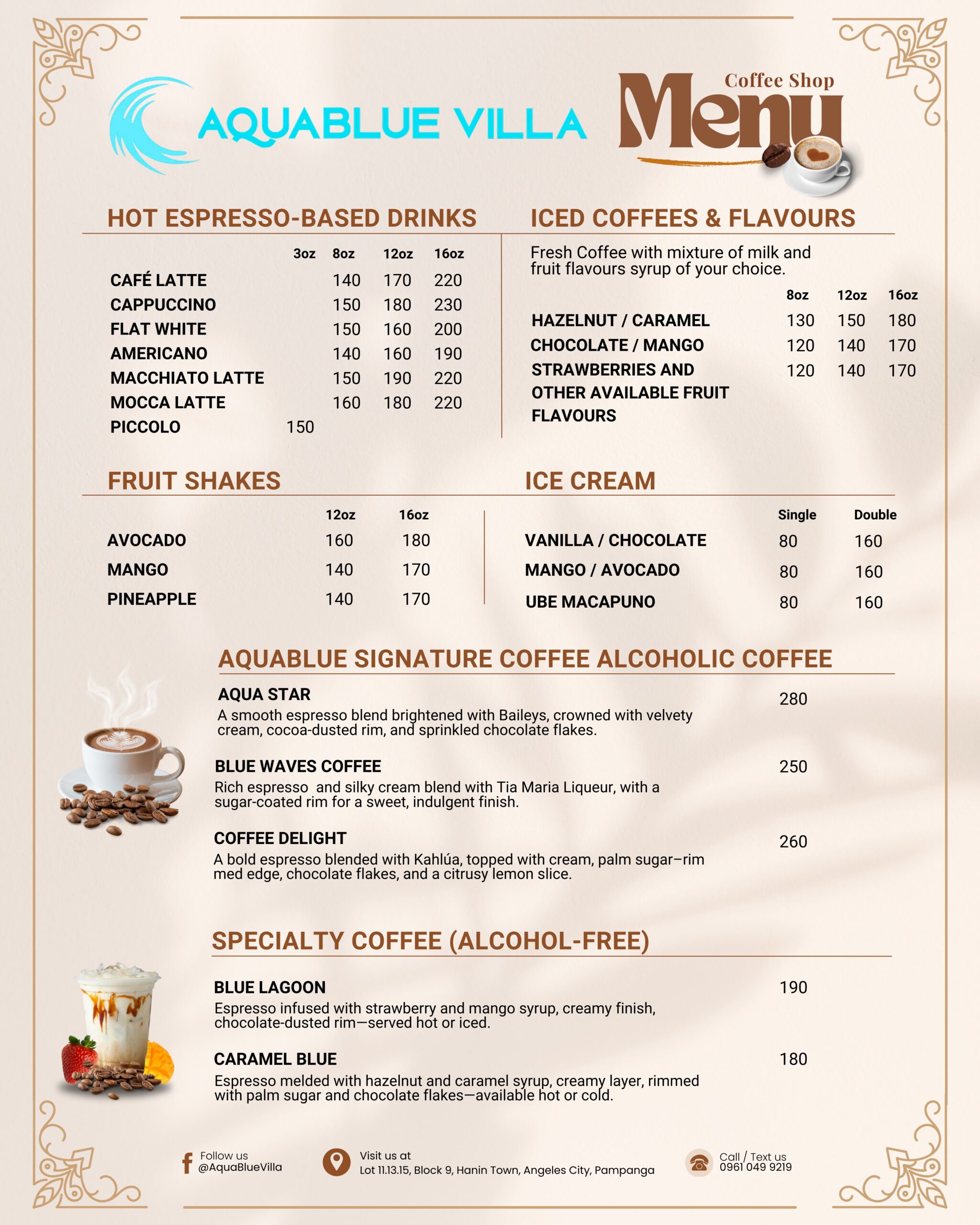At AquaBlue Villa Café, we serve freshly brewed coffee, hot chocolate, and tea for your villa stay. Whether you’re starting your day with a rich espresso, enjoying a mid-day latte, or winding down with a soothing cup of tea, our café offers the perfect blend of comfort and flavor.